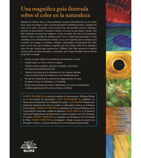 Incluye un gran número de asombrosas ilustraciones en color; explica qué es el color y cómo se origina; aborda la física, genética, química, fisiología y psicología de la percepción animal del color; analiza los colores que los humanos no ven o apenas utilizan, como los ultravioleta, los infrarrojos y los bioluminiscentes; revela la evolución de los colores en el apareamiento, la caza, la supervivencia, las artimañas y el camuflaje, y proporciona información sobre el daltonismo, los colores bioinspirados y nuestra apreciación del color en el arte y el diseño.