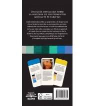 - Cada una de las 52 tarjetas presenta en su anverso un color, su historia, composición química, producción y uso; y en el reverso, una obra de arte relevante que destaca dicho pigmento. Cada pigmento va acompañado de una muestra de color visual, sumamente práctica para los artistas.